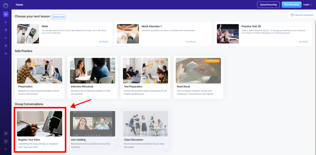 On the Home tab, you’ll find the Register Your Voice feature at the bottom. This feature enables the Speech Analyzer to recognize your voice and analyze only your speech when you’re speaking in a group setting. Please complete this step to ensure the system accurately identifies and records your speaking.