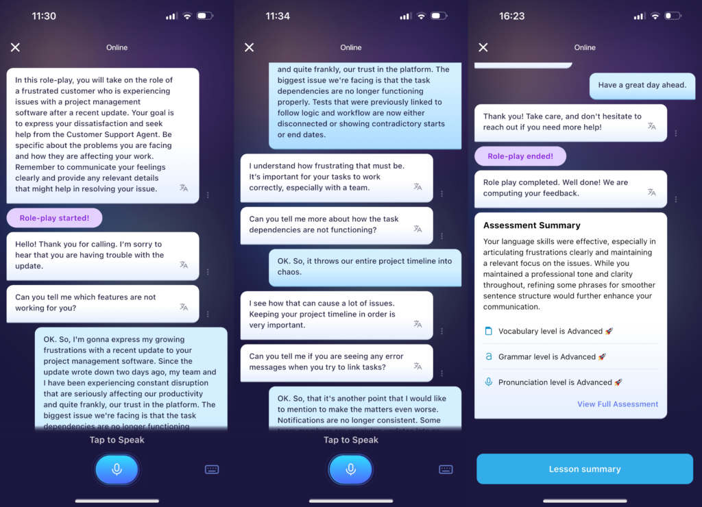 - Purpose: Simulate real-life conversations with an AI to practice speaking fluency and interaction.