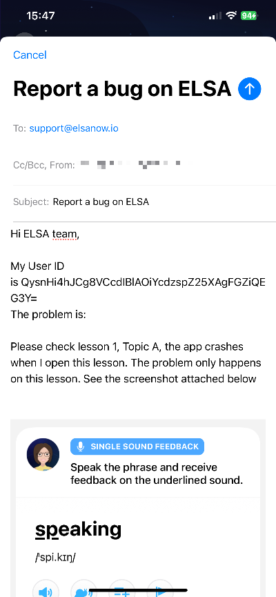 To report a bug: Go to the ELSA app > Log in to your account > Settings > Reach out to us.