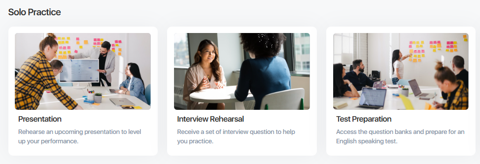 Purpose: This mode is designed for focused, individual practice where you can work on specific speaking skills or topics.