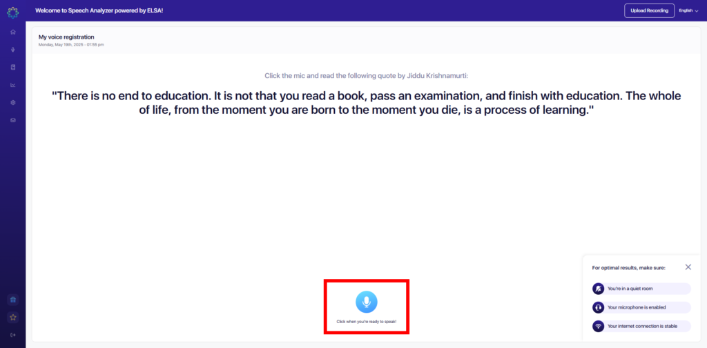 Sign in to Speech Analyzer. If you have an ELSA account, you can login with the same ELSA account’s credentials.
