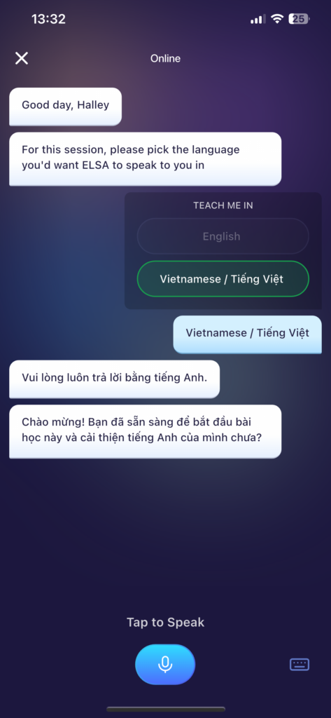 For A1 and A2 learners, you will have the option to select practicing in your Mother Tongue, and then ELSA AI avatar will automatically speak in your native language. This means that you can learn English using your native language.