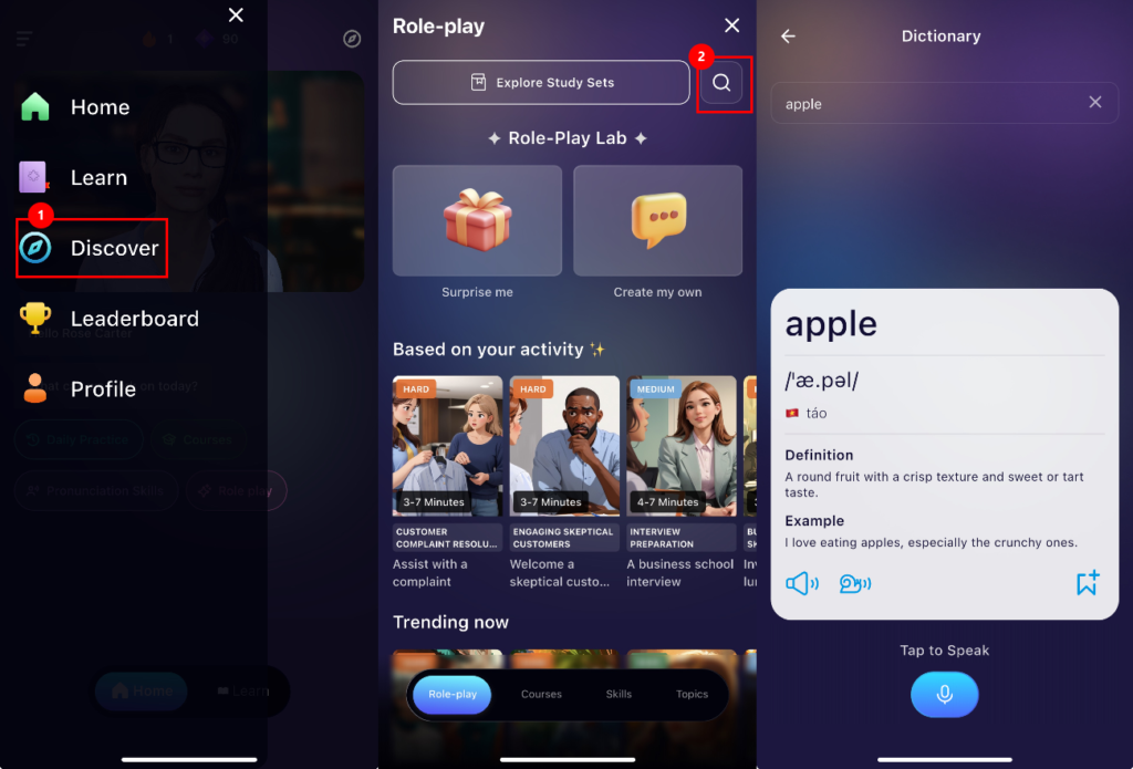 Look up any definition of words or sentences and record your voice to receive feedback on your pronunciation.