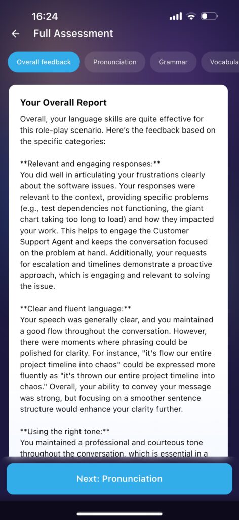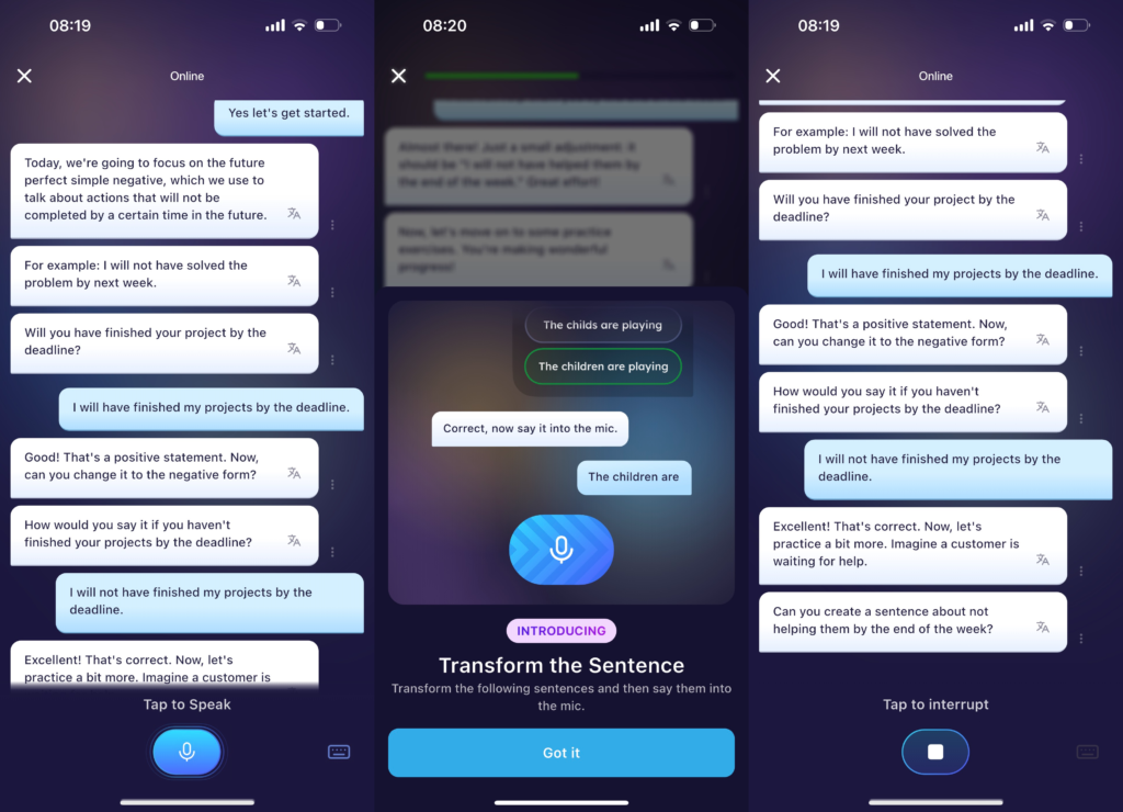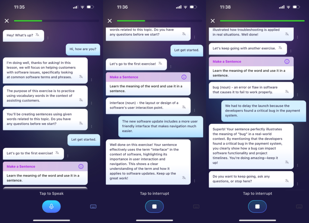 - Purpose: Simulate real-life conversations with an AI to practice speaking fluency and interaction.