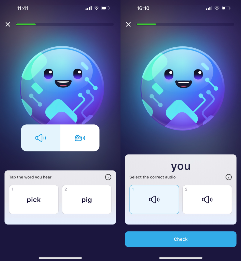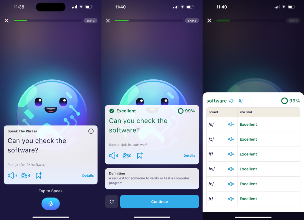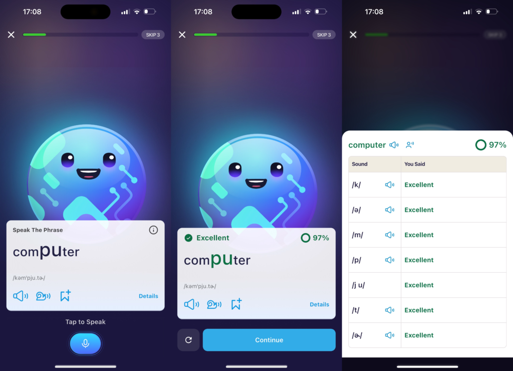 - Activities: Listen and repeat exercises; users can tap on words to get detailed pronunciation analysis.