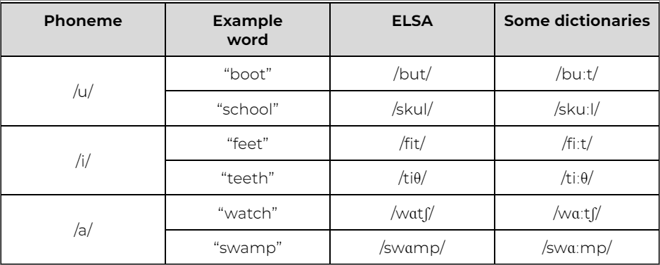 Vowel length (or duration) is predictable in English. For example, /i/ is always long, while /ɪ/ is always short. As a consequence, some dictionaries do not represent vowel length. For those that do, it is represented by the symbol /ː/. For simplicity, ELSA does not represent vowel length.