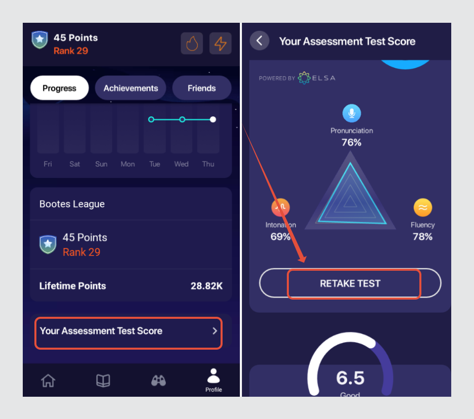 View your Assessment Test result and your level. Tap Retake Test to try the test again.