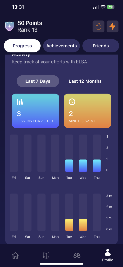 View your ELSA Score improvement in the last 7 days and 12 months.