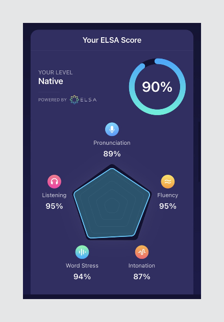 View your current level & the overall results of 5 skills (Pronunciation, Fluency, Intonation, Word Stress, and Listening).