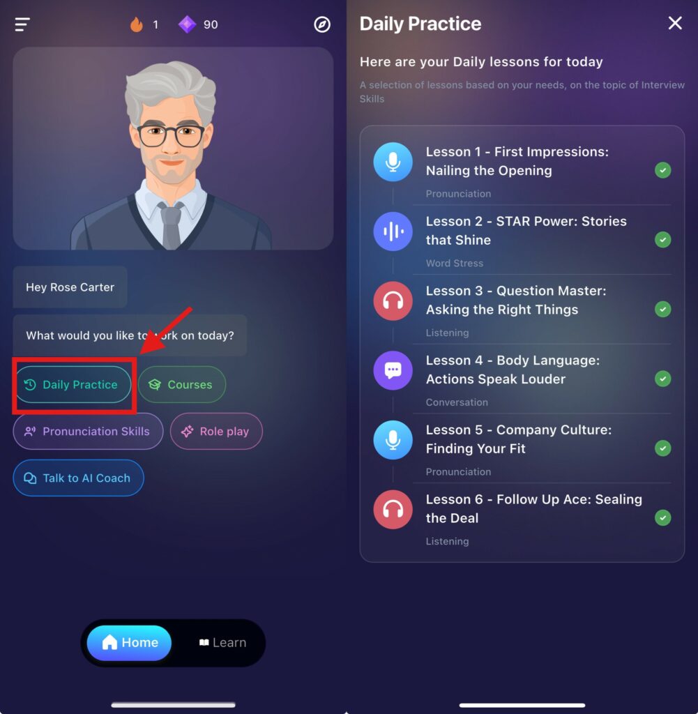 Coach brings you daily recommended lessons tailored to your English level based on your onboarding choices and your own preselected CEFR level. Complete the daily lessons to accelerate your improvements.
