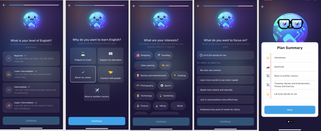 When you create your ELSA account, you’ll be guided through a few quick questions to help personalize your Learning Path. These questions are designed to tailor your learning experience based on: