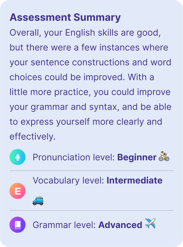 Once the role play is over, ELSA AI turns into an English tutor and give you detailed feedback on your performance.